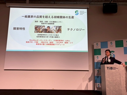 Tokyo Innovation Baseで開催された授賞式に那部理事長が登壇。”障害者で稼ぐのではなく障害者と稼ぐ”AlonAlonの農福連携モデルについて、プレゼンテーションいたしました。
